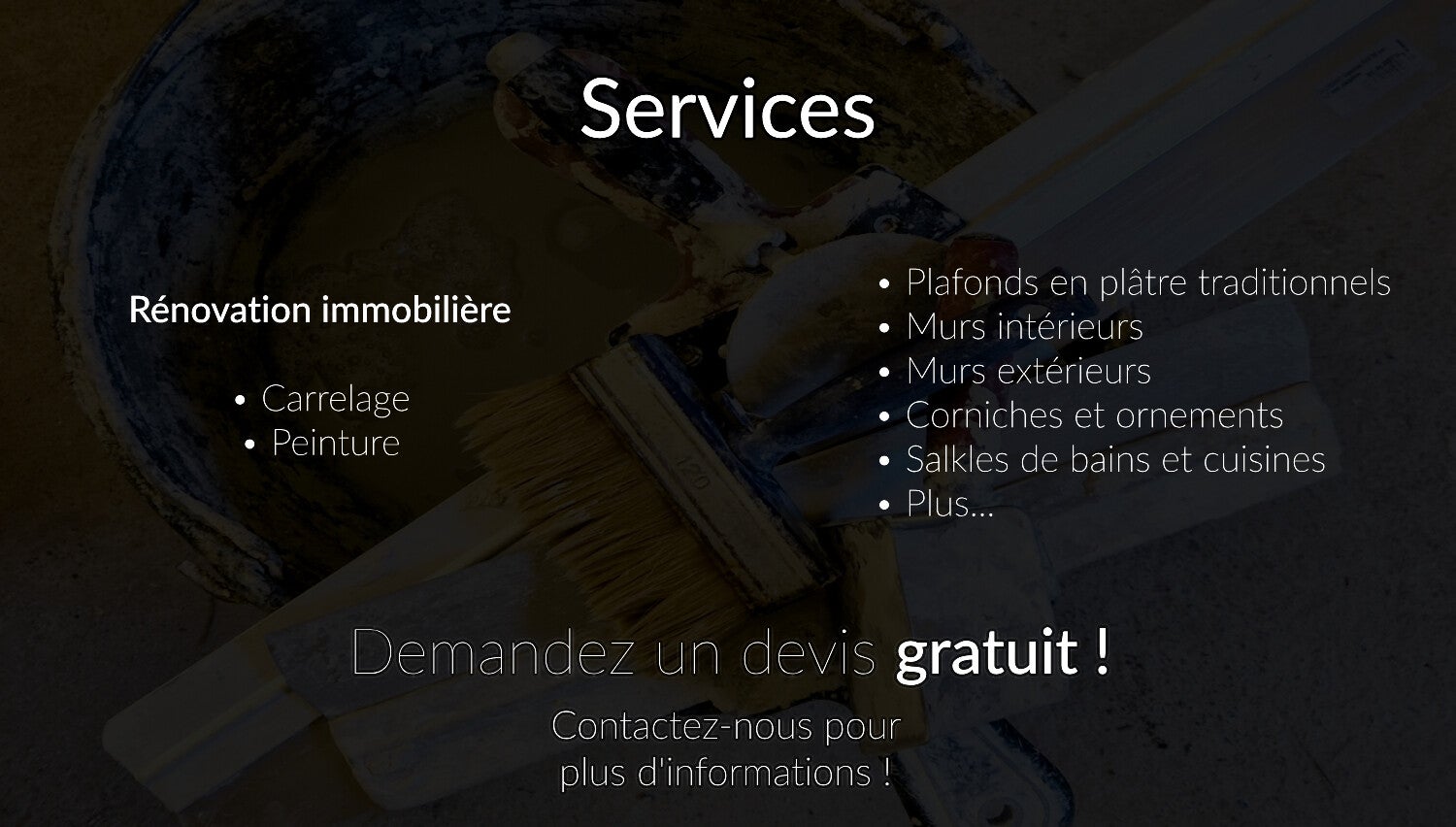 Les années d'expérience et de savoir-faire ont été transformées en une entreprise personnelle. Je peux vous proposer différentes possibilités en matière de plâtrage... Entre autres, la préparation des murs pour le papier peint, mais aussi pour d'autres travaux tels que la pose de plaques de plâtre pour les murs et plafonds, la peinture des plafonds et murs, etc.